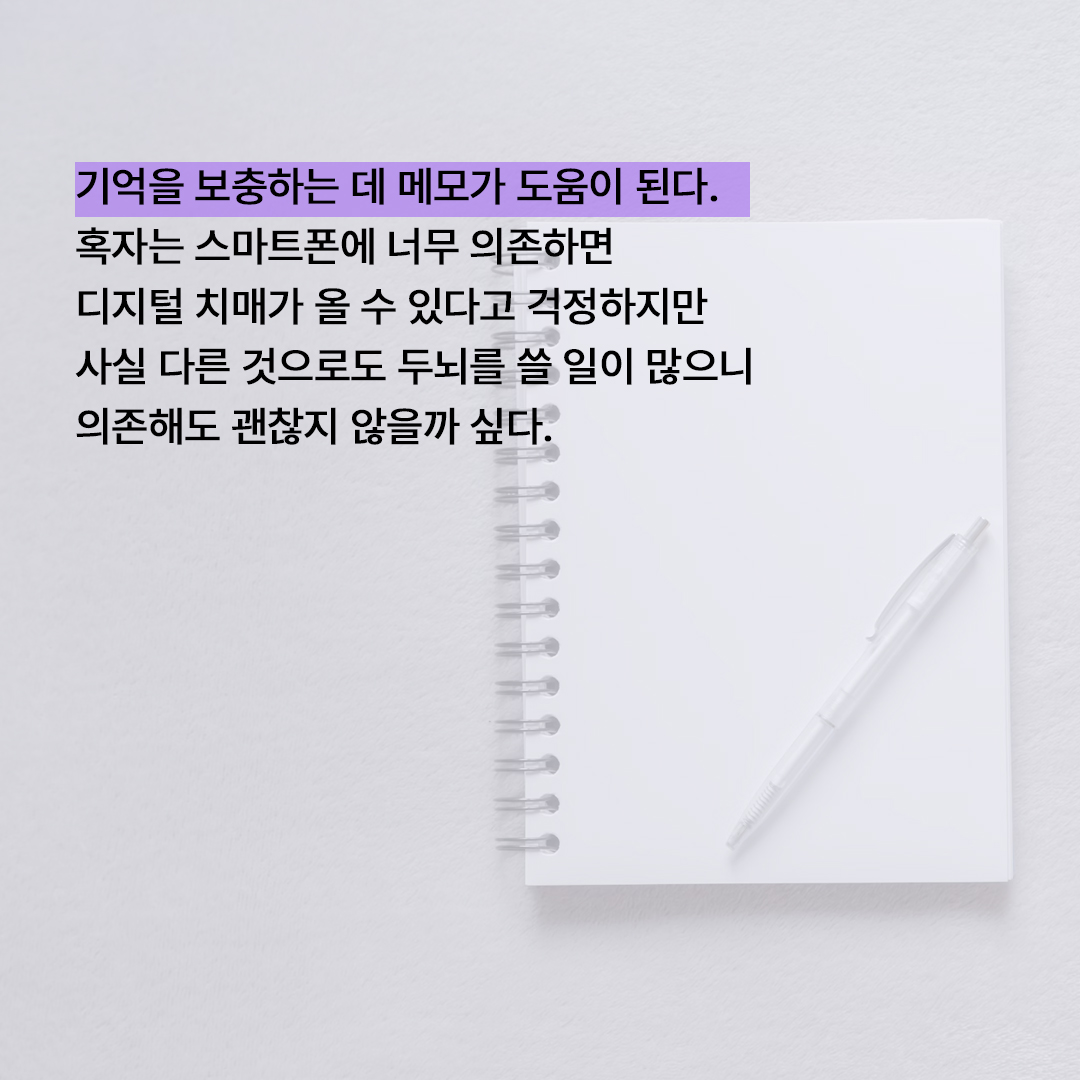 누가 그랬던가? ‘적자생존’이라고. 살아남기 위해서(생존) 열심히 적어두는 것(적자)을 말한다. 기억을 보충하는 데 메모가 도움이 된다. 사실 나이 들수록 무엇을 외운다는 것이 참 힘들다. 그럴 때는 메모하자. 종이에 메모하면 그 메모지를 어디에 두었는지 기억하기 힘들다. 스마트폰을 이용하자. 젊은 사람들은 필요한 정보를 바로 스마트폰에 입력한다. 요새는 필자도 그렇게 한다. 혹자는 스마트폰에 너무 의존하면 디지털 치매가 올 수 있다고 걱정하는데, 사실 다른 것으로도 두뇌를 쓸 일이 많으니 중요한 일들은 스마트폰에 의존해도 괜찮지 않을까? 잊어버려서 난처한 상황은 피하고 봐야 하니 말이다.