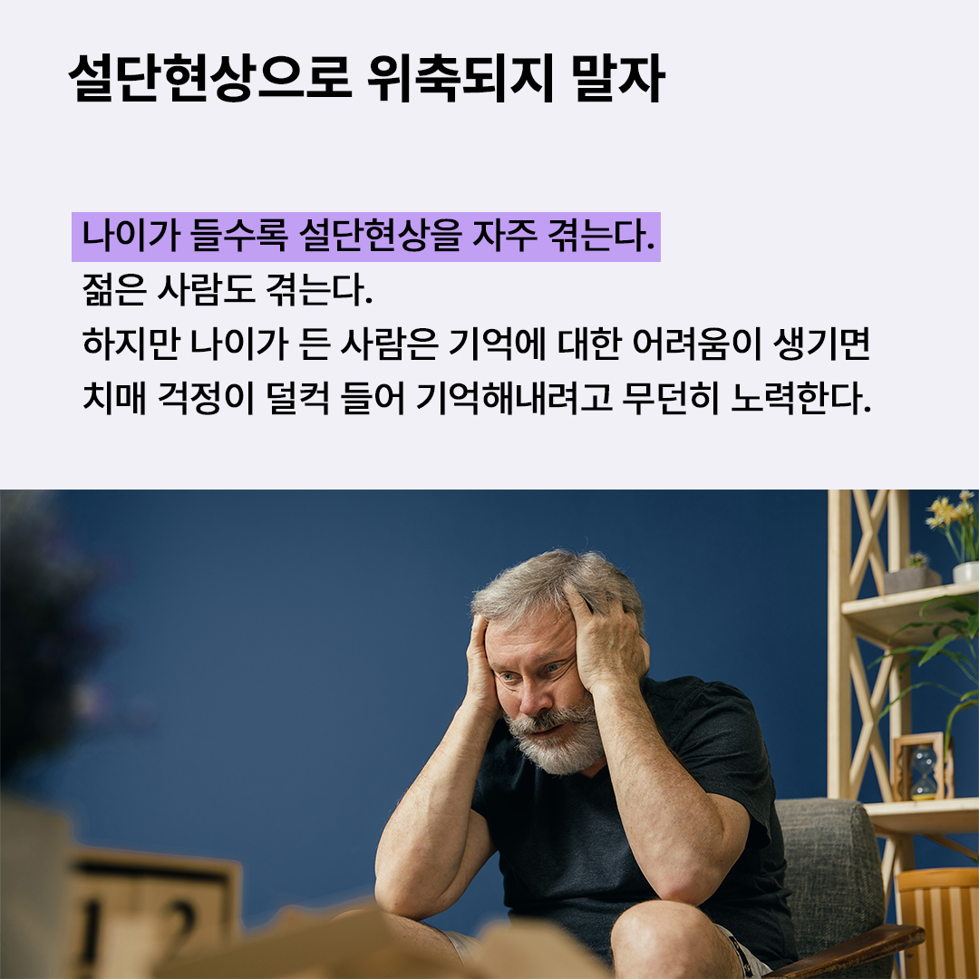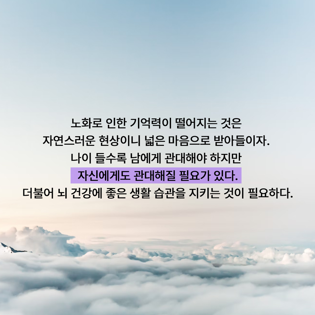 노화로 인한 기억력이 떨어지는 것은 넓은 마음으로 받아들이자. 나이 들면 예전과 달리 엉뚱한 말이 나오는 설단현상이 잦아진다. 단어의 소리와 정보를 담당하는 뇌의 영역이 다른데 이 두 영역의 연결이 약해지면서 생겨나는 자연스러운 현상이다. 나이 들수록 남에게 관대해야 하지만 자신에게도 관대해질 필요가 있다. 지나치게 자신에게 완벽함을 요구하면 스트레스만 쌓이고 이에 따라 주관적 기억 장애를 겪을 수 있다. 마음으로 관대해지는 것과 더불어 뇌 건강에 좋은 건강한 생활 습관을 지키는 것이 필요하다.