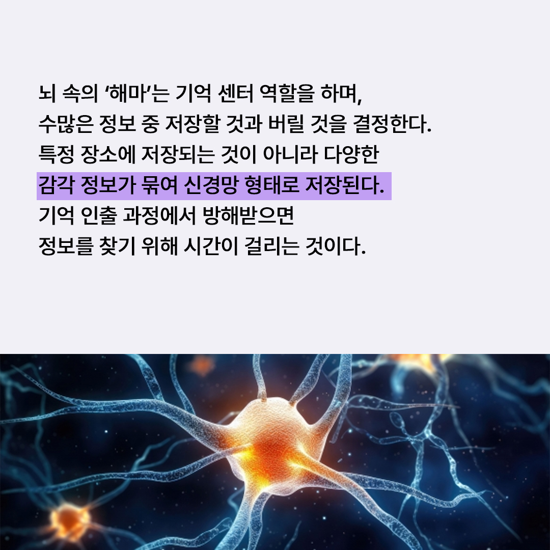 이 막중한 업무를 담당하는 것이 뇌 속의 ‘해마’다. 그래서 해마의 별명은 기억센터다. 해마는 들어오는 수많은 정보 중에서 저장할 것과 버릴 것을 빠르게 고르고, 저장할 만한 의미 있는 정보들을 장기기억으로 저장하도록 조처한다. 예를 들어, 졸린 눈 비비고 출근길을 가더라도 간판이며 지나가는 사람이며 길 위의 수많은 정보가 들어온다. 이렇게 수많은 정보 중에서 우리가 주의를 기울이는 것들을 일단 기억 후보로 인지해 뇌에 전달된다. 오늘 점심에는 무엇을 먹을 것인가 고르며 가게를 지나간다면 음식점 이름과 외관이 다른 가게보다 우선해 기억 후보군에 오른다. 그리고 점심시간이 가까워지면 그 가게를 떠올리면서 점심 메뉴를 생각하며 즐겁게 사무실을 나갈 준비를 한다.