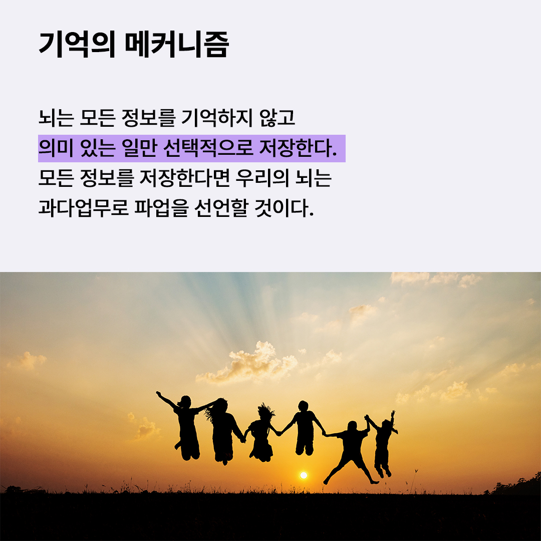 잠에서 깨면 대부분 보고 듣는 기능이 시작되기 때문에 감각기관으로 들어오는 모든 정보를 저장한다면 오전 중에 아마 우리의 뇌는 과다 업무로 파업을 선언할 것이다. 그래서 사람의 뇌는 의미 있는 일들을 골라서 저장한다.