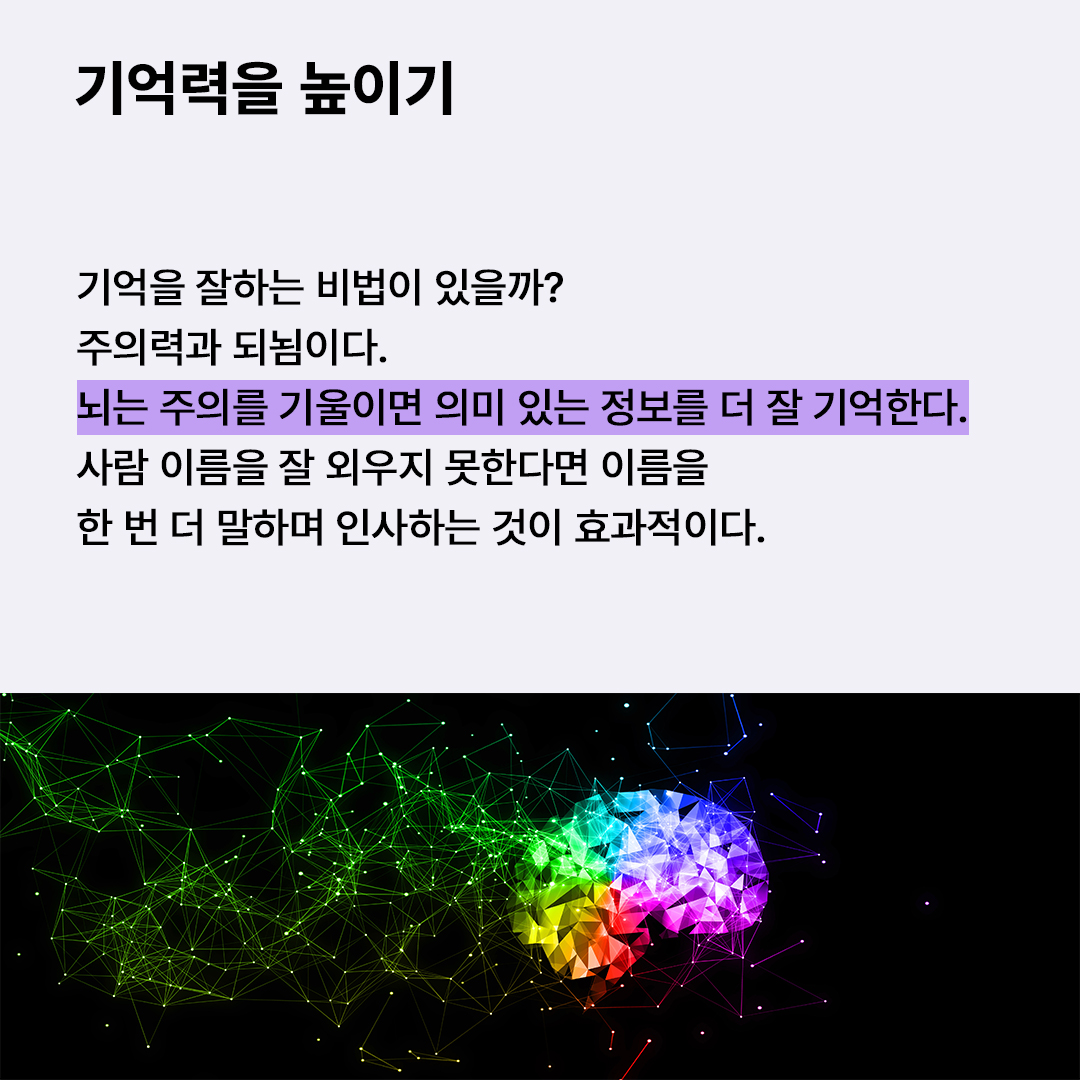 아무리 젊은 사람도 기억력이 부실한 일들이 자주 일어나면 불안하고 불편하다. 그렇다면 기억을 잘하는 비법이 있을까? 주의력과 되뇜이다. 뇌는 주의를 기울이면 의미 있는 정보를 더 잘 기억한다. 따라서 사람 이름을 잘 못 외운다면 상대방이랑 인사하면서 들은 이름을 한 번 더 말하며 인사하는 것이다. 예를 들어, “홍길동입니다.”라고 상대방이 자기 이름을 소개하면 “홍길동 님, 만나서 반갑습니다”라는 식으로 한 번 더 이름을 입으로 말하며 주의를 기울이고 되뇌는 방법이 요긴하다.