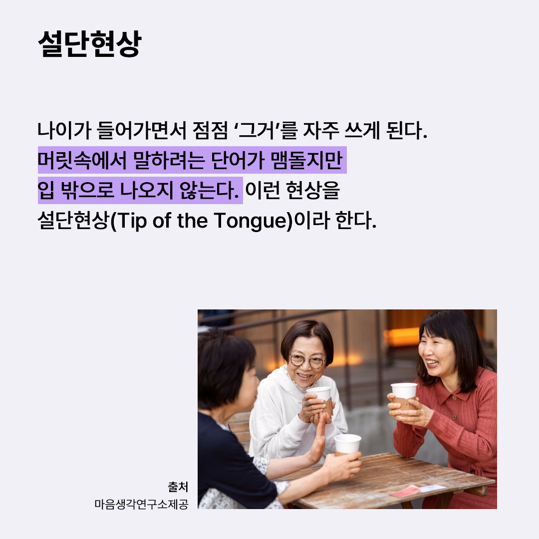 나이 들수록 설단현상을 자주 겪는다. 하지만 젊은 사람도 겪는다. 똑같이 특정한 단어에 대해 기억이 날 듯 말 듯 할 때 젊은 사람과 나이 든 사람이 대처하는 방법이 조금 다르다. 나이 든 사람은 일단 어떻게든 기억해 내려고 무던히 노력한다. 기억력이 문제가 있다고 생각하고 싶지 않기 때문이다. 젊은 사람과 달리 나이 든 사람은 기억에 대한 어려움이 생기면 치매 걱정이 덜컥 들기 때문이다. 젊은 사람은 그냥 스마트폰을 열어 구글 검색을 한다. 이들에게 치매나 노화는 관심거리가 아니기에 설단현상은 별거 아닌 것으로 받아들인다.